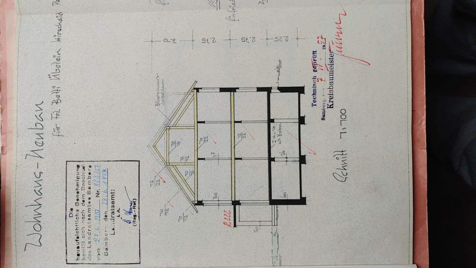Auf dem Grundstück befindet sich ein zweigeschossiges Zweifamilienhaus aus dem Jahr 1957,